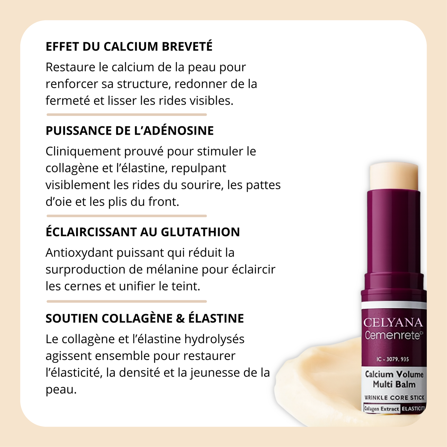 un seul passage apporte un boost de calcium pour renforcer la peau, de l’adénosine pour lisser les rides, et un complexe collagène + élastine pour redonner rebond et fermeté.