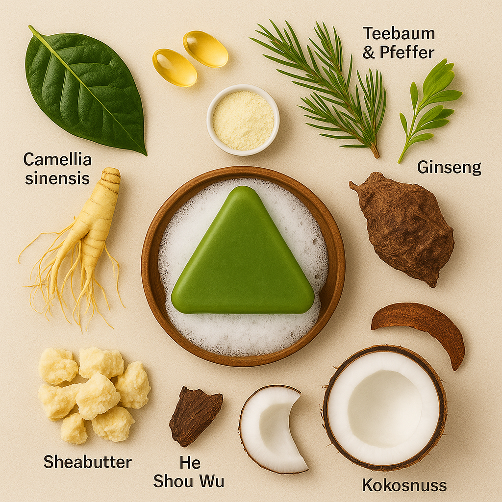 RomarinGinsengCamellia SinensisReishi NoirNoix de SavonBeurre de KaritéVitamine B5RomarinFleurs d’OsmanthusÉcorce de SophoraArbre à Thé & PoivreHe Shou WuNoix de CocoThuya de ChineKératine